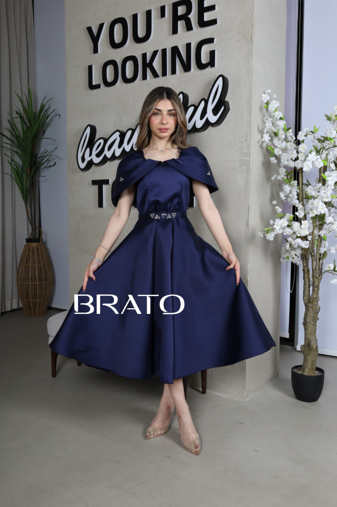 فستان كحلي بقصة انيقة وتطريز من الاكمام
