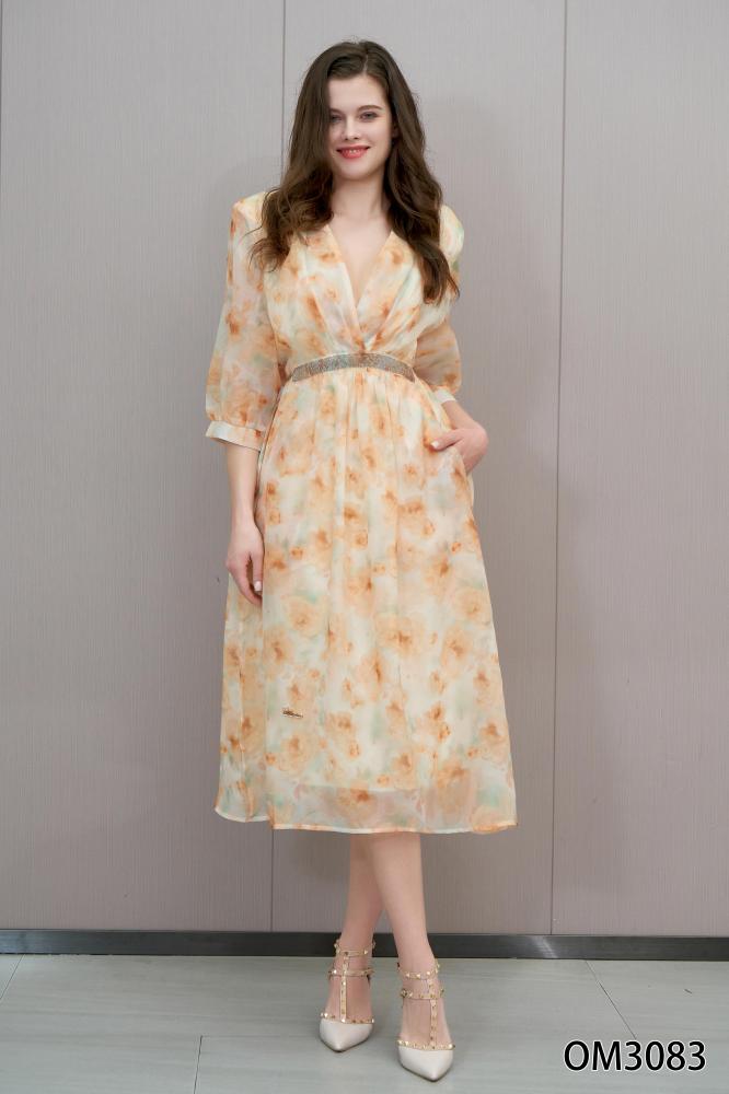 • اللون منجاوي بنقشة عصرية تزين الفستان