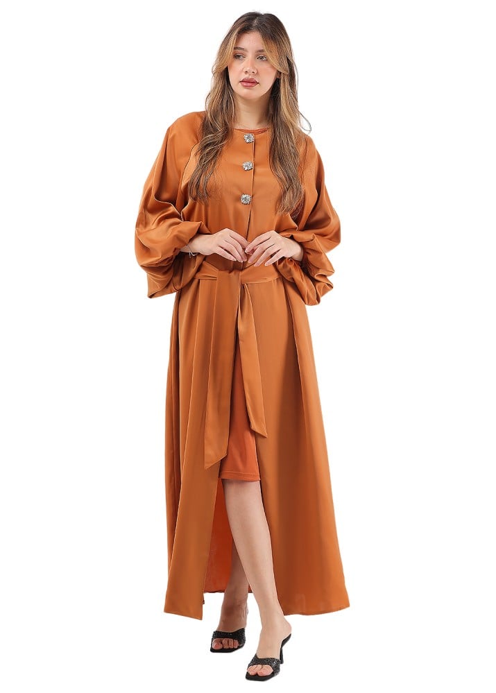ابهري الحضور باطلالة ملكية بجلابية من الحرير الناعم والذي جات بقطعتين متناسبتين يربط بينهم حزام قماشي تزيد مضهرك اكثر جمالا وتالق لتكتمل الاناقة بازرار كرستالية أمامية